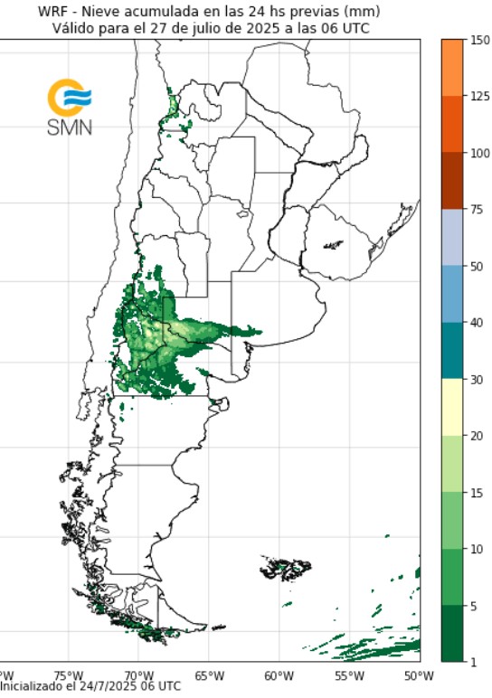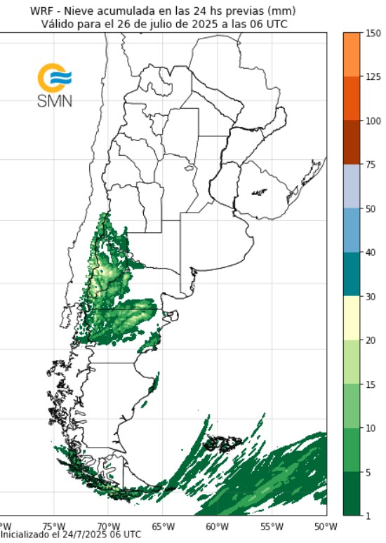 Las acumulaciones de nieve previstas podrían alcanzar entre 25 y 40 cm en la cordillera del centro-sur de Mendoza, y entre 5 y 10 cm en zonas llanas. En la meseta patagónica, se esperan acumulados entre 10 y 20 cm, mientras que en la cordillera patagónica los valores podrían oscilar entre 30 y 50 cm, e incluso superarlos.